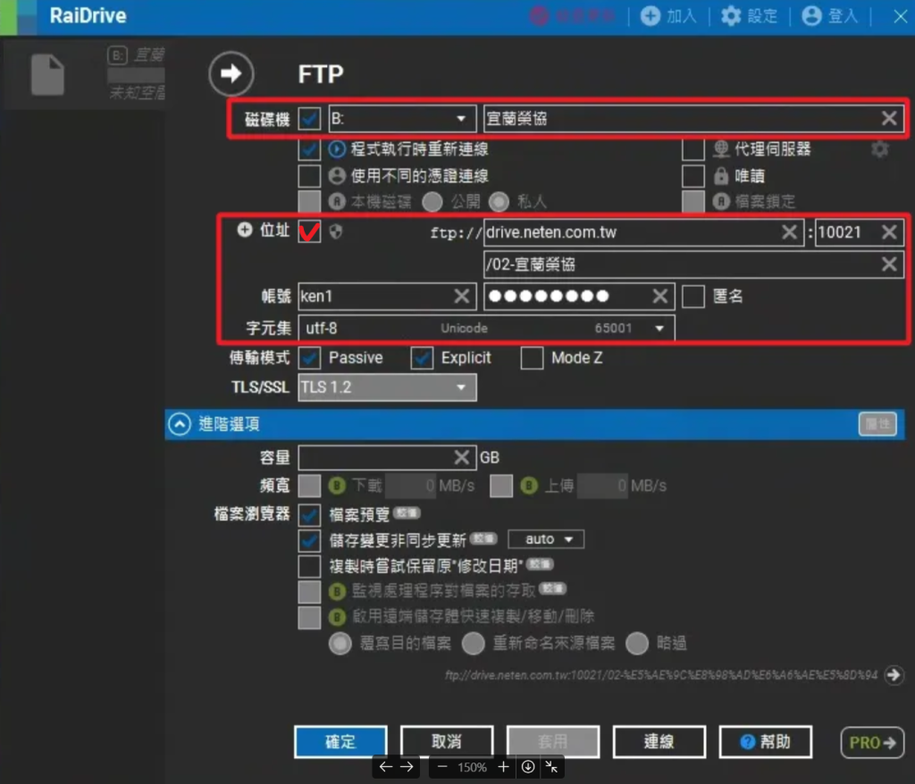 200 秘書處 204 資訊組 網路硬碟軟體安裝 – 電腦RaiDrive軟體 ken1 12 月 20, 2025 0 Windows電腦程式 推薦使用 RaiDrive 軟體 (FTP 方式連線) 連接 下載 RaiDrive 下載/安裝 RaiDrive 軟體 設定說明 磁碟機:建議設定為 B 磁碟名稱:宜蘭榮協 (非必要) 位址:ftp.neten.com.tw 埠號:10021 路徑:/02-宜蘭榮協 帳號:輸入 資訊組 開給您的帳號 密碼:輸入 資訊組 開給您的密碼 查看 QR-Code× 🠋 下載 QRCode 🠋 點擊便能為這篇文章進行評等! [評等總次數: 0,平均評等: 0] 軟體應用雲端硬碟